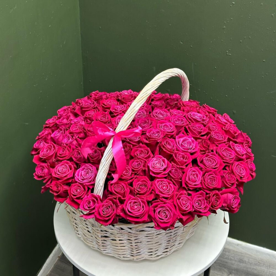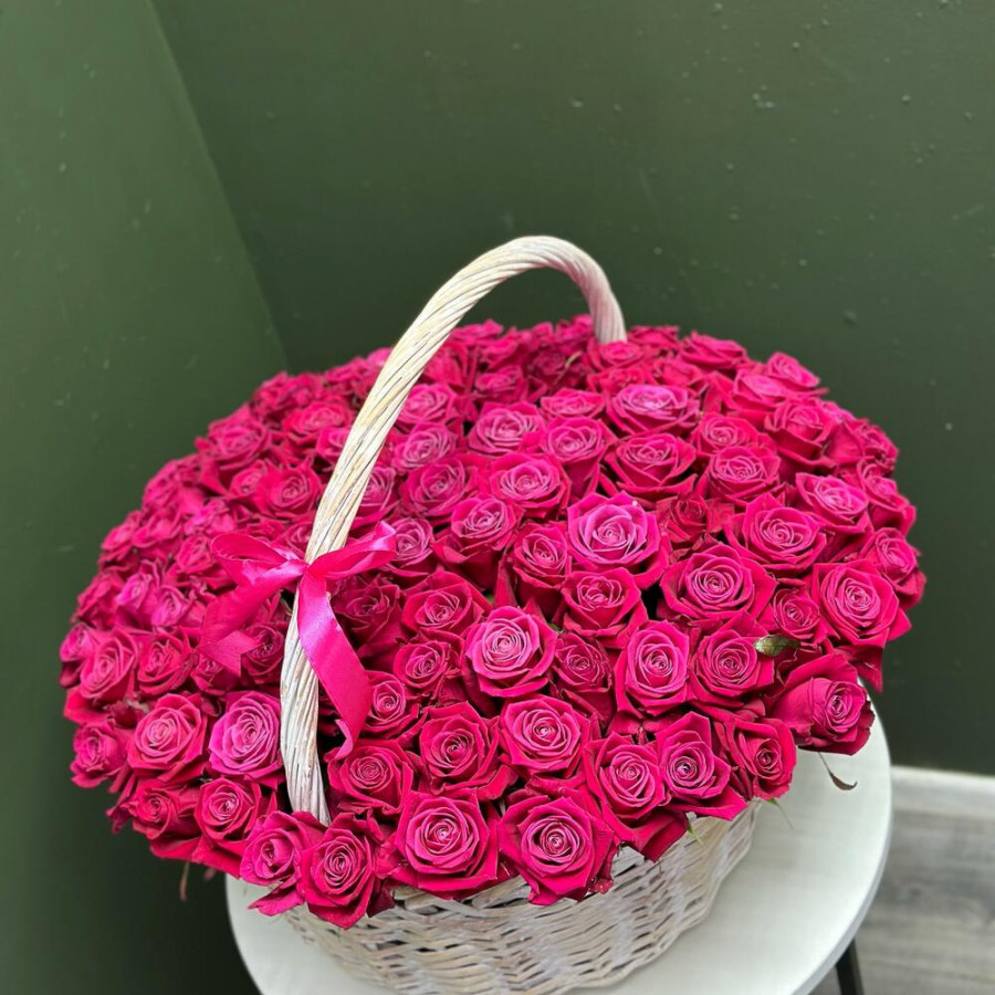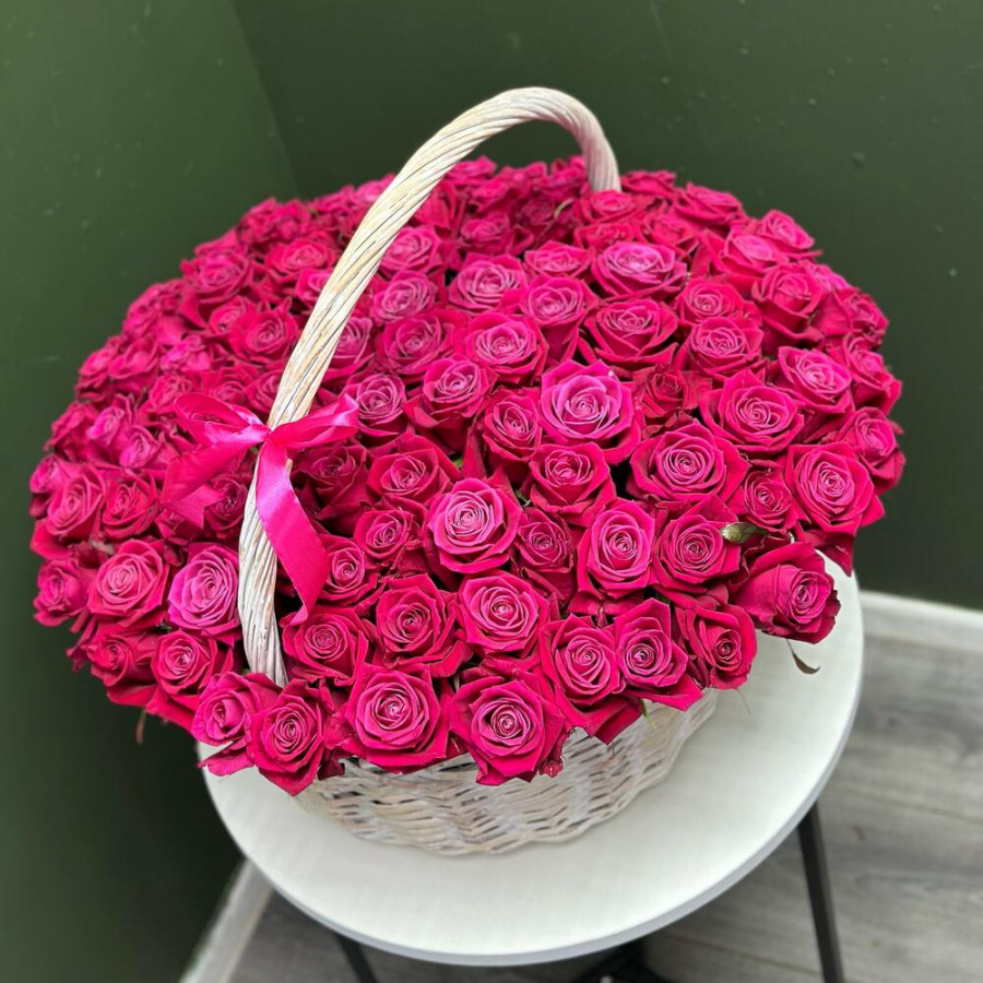 На фото 101 малиновая роза в корзине. В составе: роза 101 шт, оазис флористический 3 шт, корзина (xl) 1 шт, . Все цветы свежие и ароматные, букет красиво оформлен и отлично подходит для подарка. Доступна доставка цветов или самовывоз.