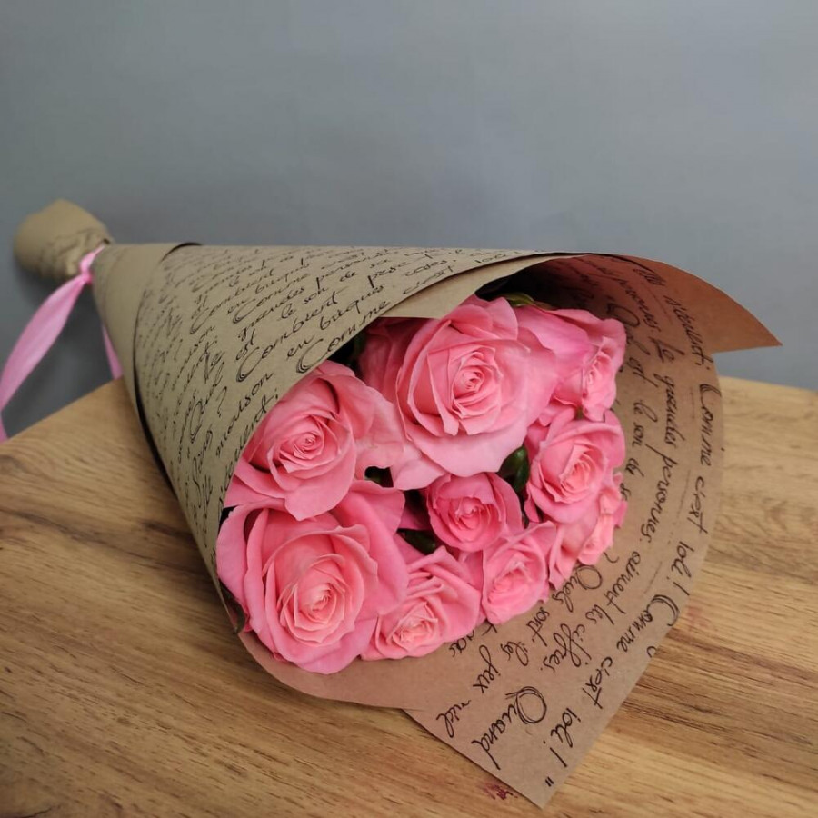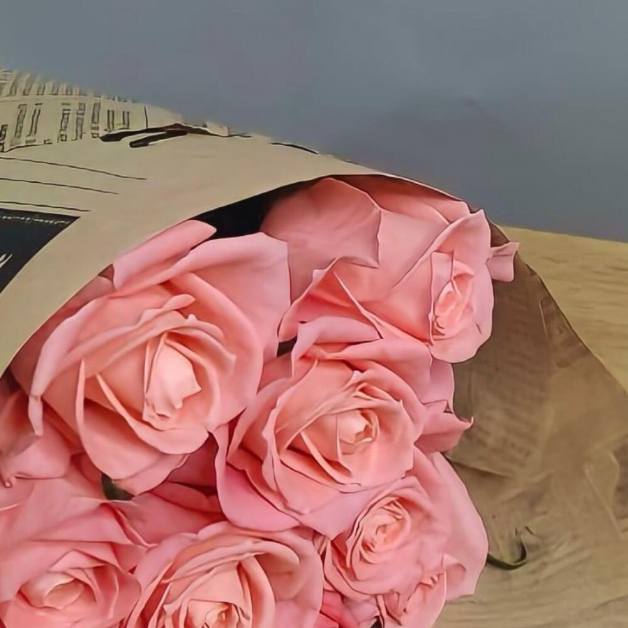 На фото букет из 9 коралловых роз. В составе: роза 9 шт, крафт-бумага 1 шт, атласная лента 2 шт, . Все цветы свежие и ароматные, букет красиво оформлен и отлично подходит для подарка. Доступна доставка цветов или самовывоз.
