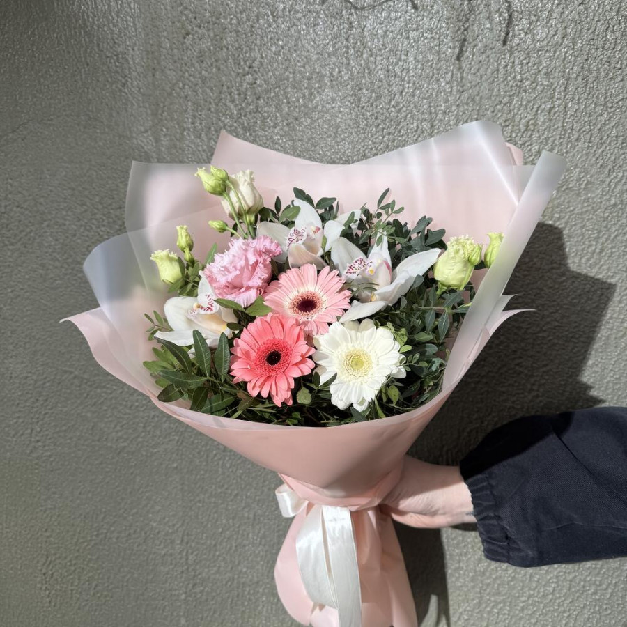 На фото букет «нежный роман». В составе: орхидея 3 шт, эустома (лизиантус) 1 шт, гербера 3 шт, писташ 5 шт, дизайнерская упаковка 1 шт, атласная лента 1 шт, . Все цветы свежие и ароматные, букет красиво оформлен и отлично подходит для подарка. Доступна доставка цветов или самовывоз.