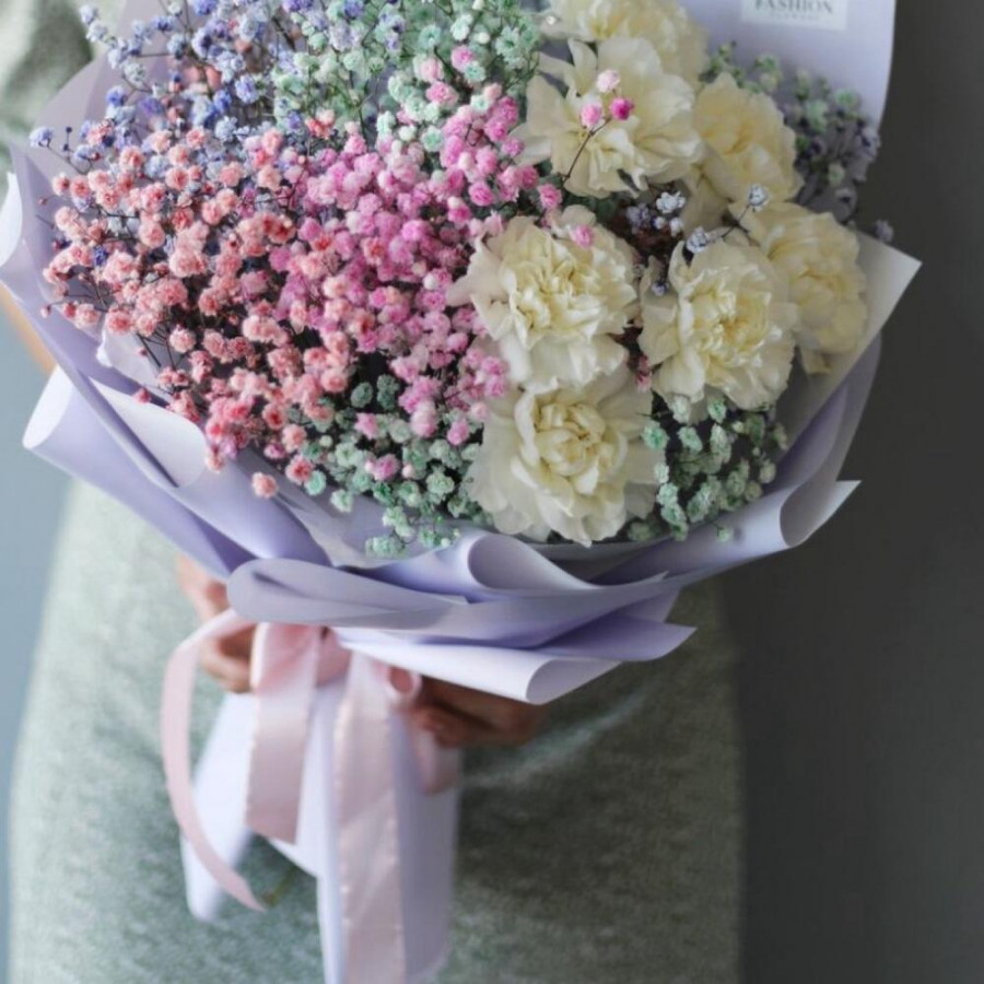 На фото букет «северное сияние». В составе: гвоздика 7 шт, гипсофила 5 шт, писташ 4 шт, дизайнерская упаковка 1 шт, атласная лента 1 шт, . Все цветы свежие и ароматные, букет красиво оформлен и отлично подходит для подарка. Доступна доставка цветов или самовывоз.